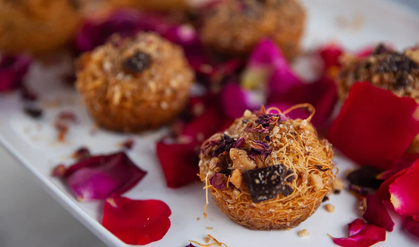 Bake in a low oven, 160C for 60-90 minutes. Take out of the oven. Pour cold syrup on hot Kataifi. Decorate with nuts mixture and rose petals.