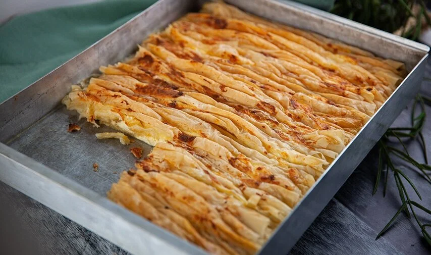 Open the Filo Pastry flat on the working bench and cover with a damp tea towel.