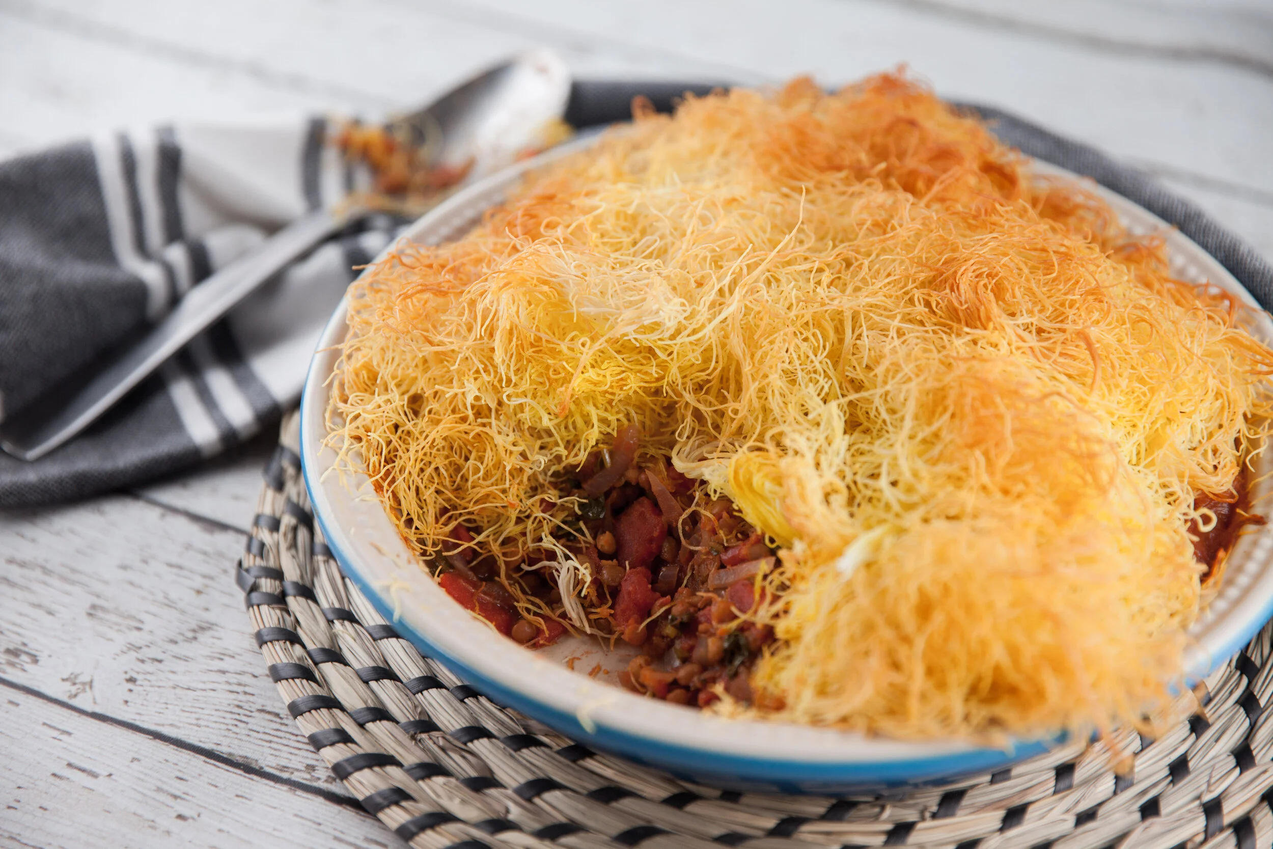 Place the lentil filling in an oven dish and lay the Kataifi Pastry evenly over the lentils to form the pie top.