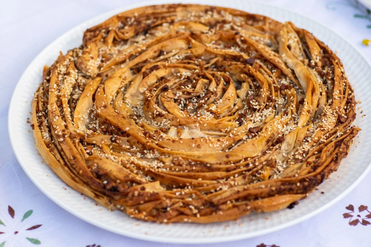 Brush two sheets of Fillo Pastry with butter and lay them onto your baking tray to form a cross. These will form the base of your crinkle cake. Lay one sheet of Fillo pastry onto your workspace, with the long side of the Filo Pastry facing you. Brush with butter and lay a second sheet of Filo Pastry on top. Brush with butter. Sprinkle 3 to 4 tablespoons of the walnut mixture evenly across the layer of pastry. Using your fingers, crinkle the Pastry in a concertina design. Coil the Pastry to resemble a rose and transfer it to the middle of the baking tray. Repeat with the remaining Fillo Pastry, placing it around the centre rose until the tray is full. Roll the bottom edges of the pastry in. Scatter any remaining nut mixture over the baklava and sprinkle with sesame seeds.