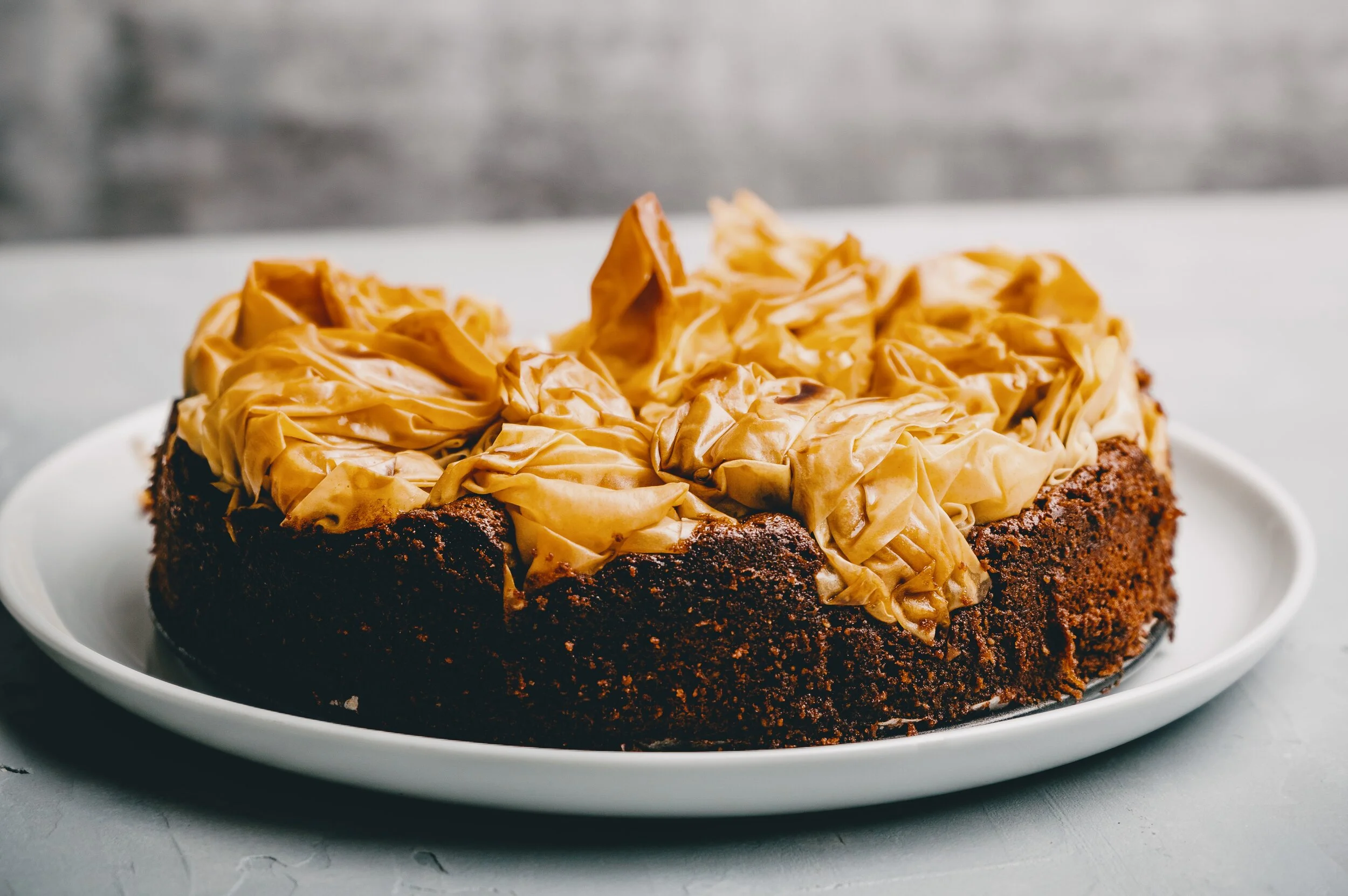 Place the cake in the oven to bake for 5 minutes before removing & placing the Fillo scrunches on top & returning to oven - this prevents them from sinking into the cake.