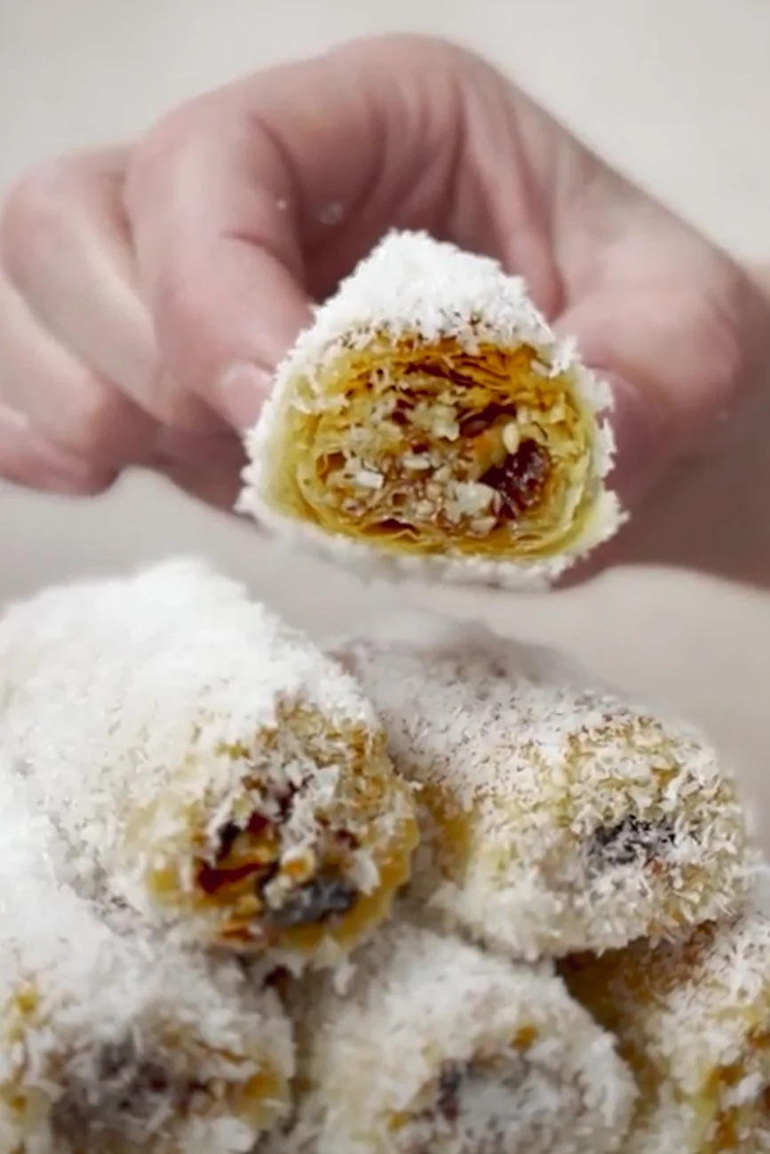 Pour the syrup over the hot baklava. While it is still hot, remove one roll at a time from the tray and dip it into a bowl of coconut, coating it well on each side. Transfer to a serving platter. Repeat with remaining rolls. Sprinkle with extra coconut.