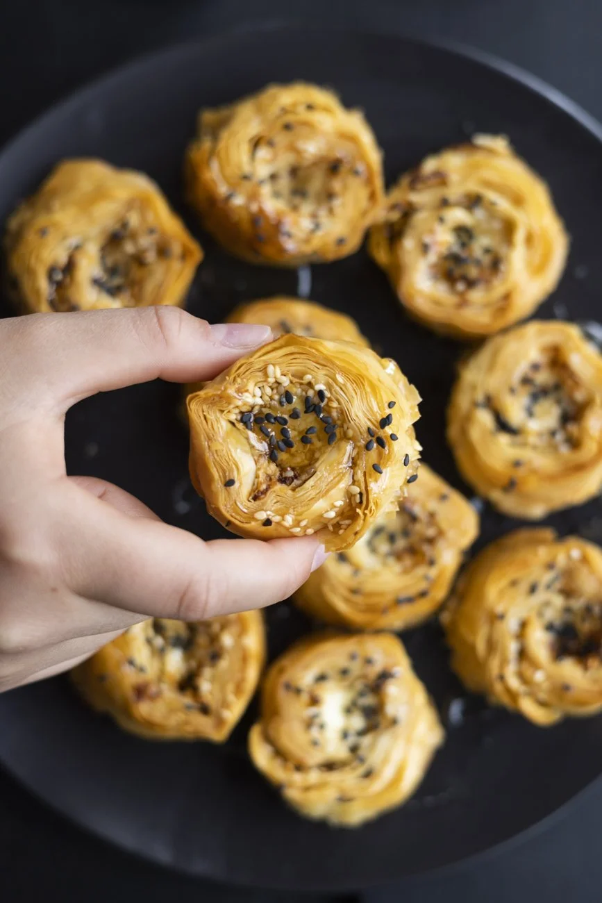 Slice the feta cheese into long strips, approximately 1-1.5cm in thickness. Place the stack of Fillo Pastry on your workbench. Cut in half lengthwise to create two stacks. Brush the top sheet of each stack with butter. Sprinkle each stack liberally with chilli flakes and sesame seeds. Position the feta cheese along the length of the pastry, approximately 1.5cm from the edge, on each stack. Fold the bottom edge of the pastry over the feta and roll firmly to create a long log. Repeat with the second stack of pastry. Using a sharp knife, slice each log into 15 pieces. Transfer each piece to a hole of the muffin tin. Pour one tablespoon of butter over each piece carefully, so that the butter drizzles over the rolled pastry.