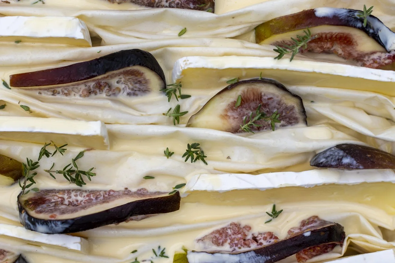Drizzle the melted butter over the tray using a Pastry brush. Slot the sliced brie and figs into the Pastry layers. Pour the cream and egg mixture over the Pastry. Sprinkle with thyme.