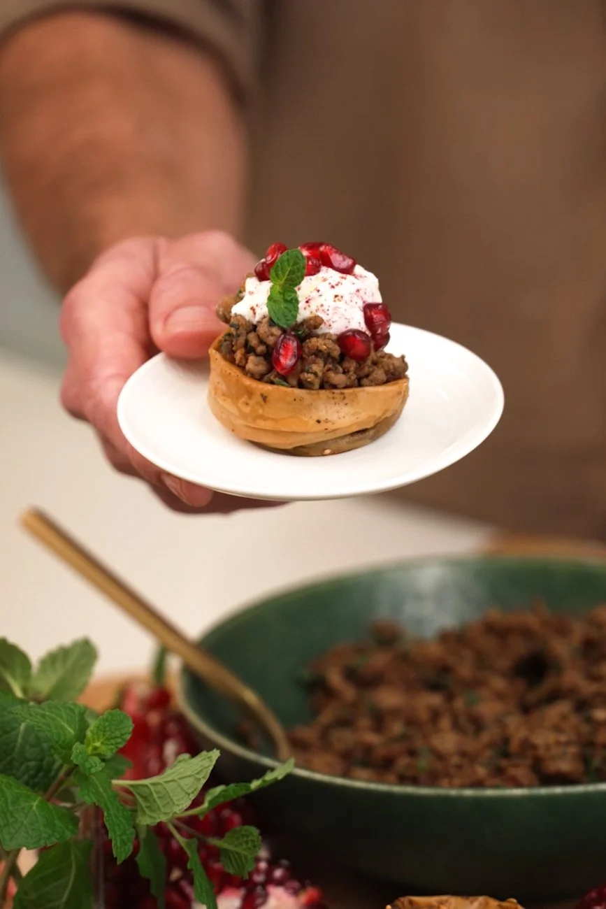 Top each bite with some of the spiced lamb, followed by the labneh, pomeganate arils and mint leaves.