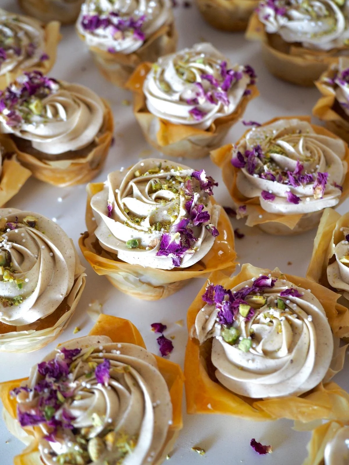 We recently commissioned the help of the very talented Mary from Mary’s Kouzina to create some edible gifts for our staff, as part of our 60th birthday celebrations. Mary created these beautiful and very delicious Baklava Cupcakes which our entire team devoured in seconds! Mary used layers of Fillo Pastry as a cupcake patty, which she then filled with the most delicious cinnamon and walnut flavoured cake and topped them with a creamy salted Swiss meringue buttercream. We guarantee once you’ve made these once, they will be on repeat!