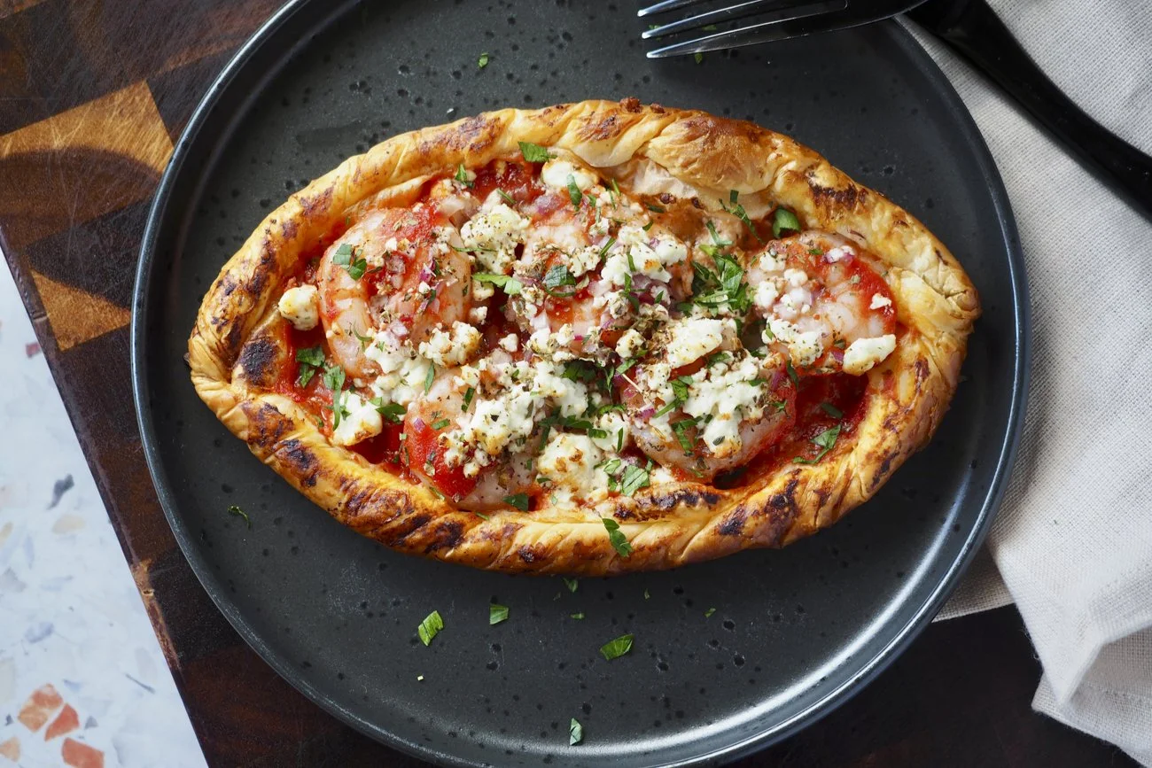 Place 5 to 6 prawns onto the passata then spread another tablespoon of pasatta onto the prawns. Sprinkle over chopped red onion followed by crumbled feta cheese and a pinch of oregano. Brush the edges with extra virgin olive oil.