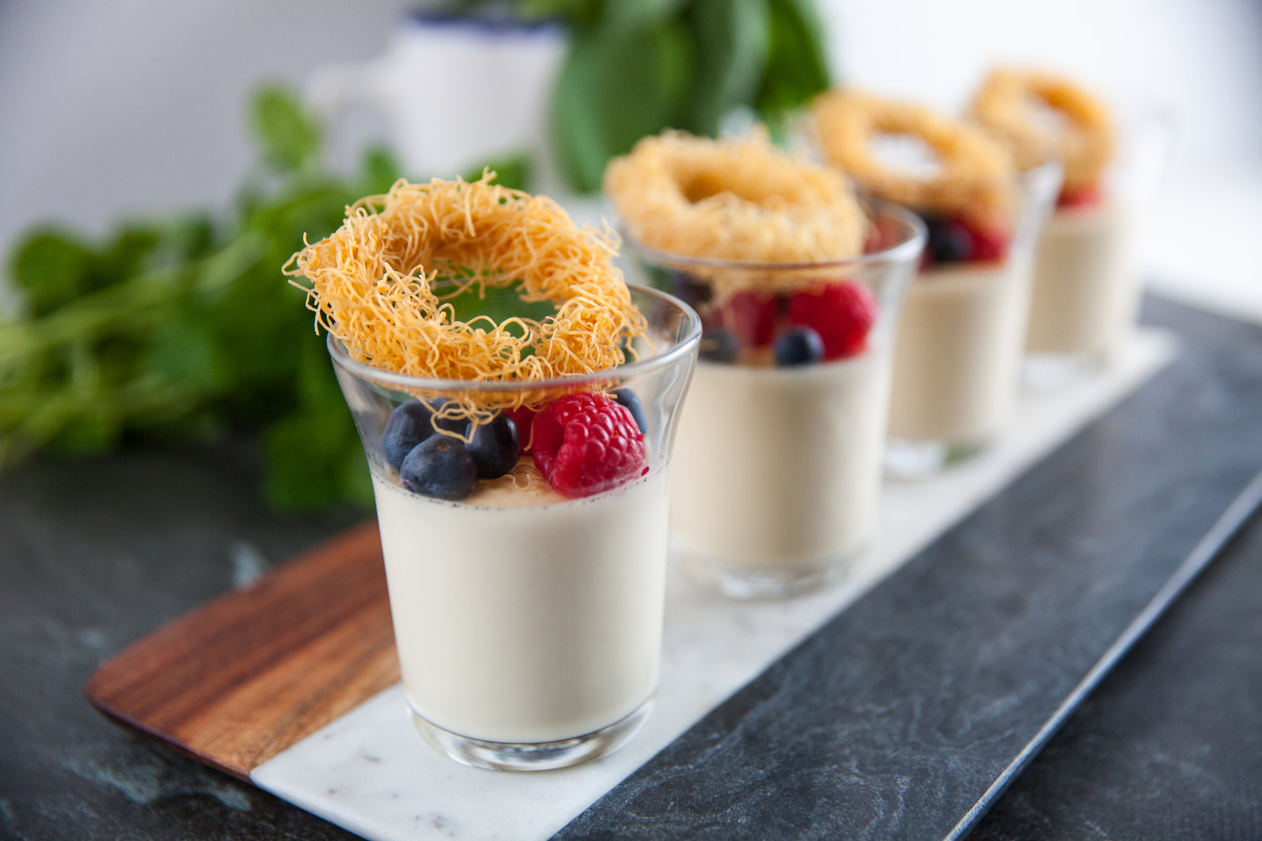Prepare your fruit cups by placing a kataifi disc on the bottom of the glass. Add cream or yoghurt, followed by fruit & garnish. Repeat this method until the cup is full (approx. 3 discs).
